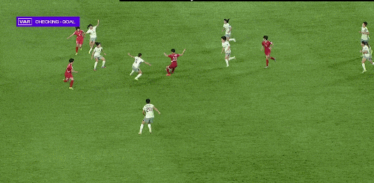 边裁第一时间举旗示意越位,VAR介入之后,清晰显示朝鲜有一名后卫的脚跟拖在了最后,王霜根本不越位,主裁判改判进球有效,中国队2-1反超比分。