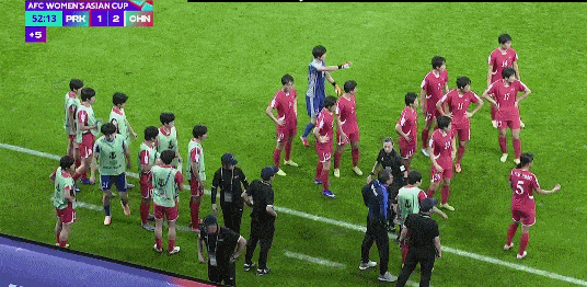 这个判罚引发了朝鲜队的集体不满,球员们围堵裁判,主教练甚至把队员叫到场边拒绝恢复比赛,主裁判直接鸣哨结束了上半场。