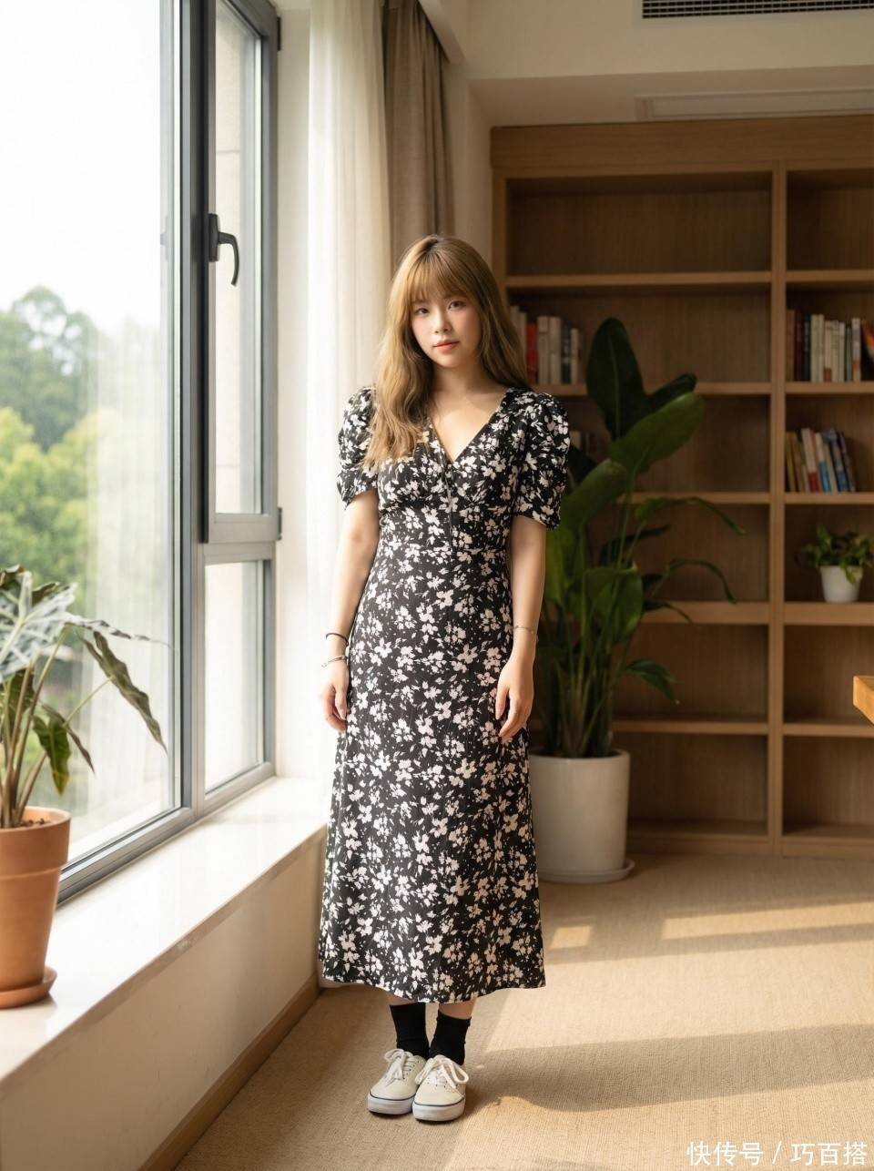 但如果你身材一般、气质一般并且缺乏自信,在选择时尽量不要碰吊带款式的碎花裙,选择带袖碎花裙是最安全也是最省心的选择,对首次尝试碎花裙的姐妹来说,一定谨记这一点。