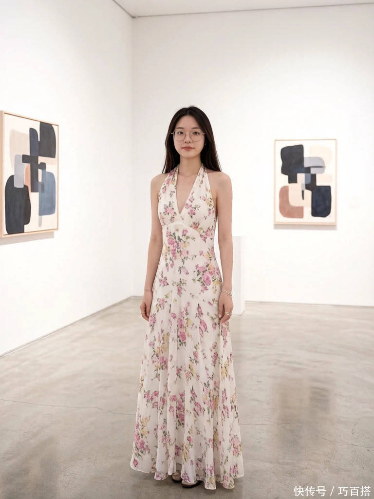 除了细吊带外,大家也可以尝试博主身上这类挂脖式碎花裙,轻熟性感氛围让人赚足回头率。