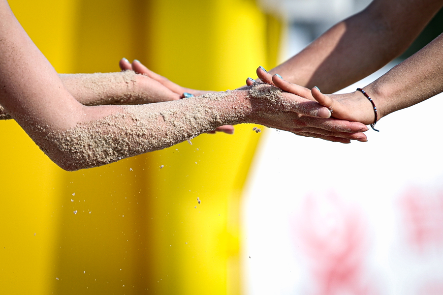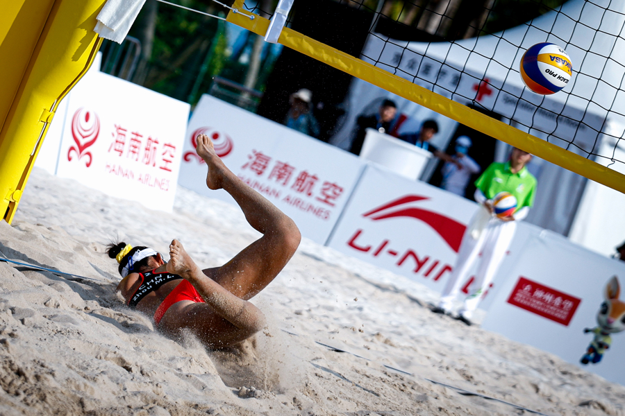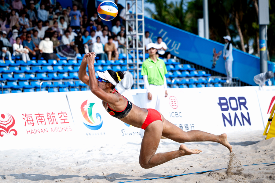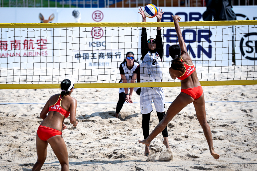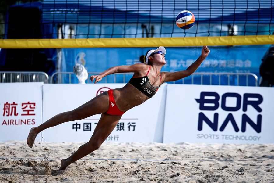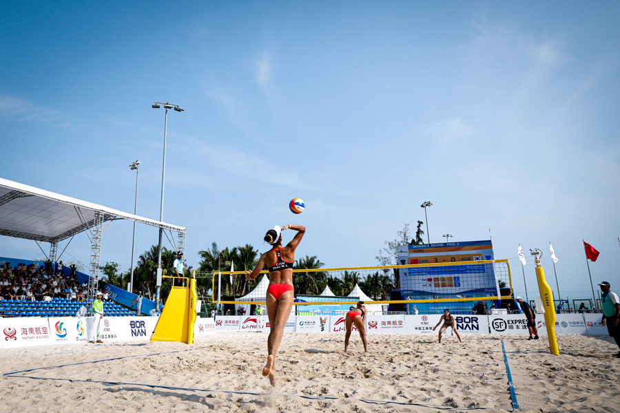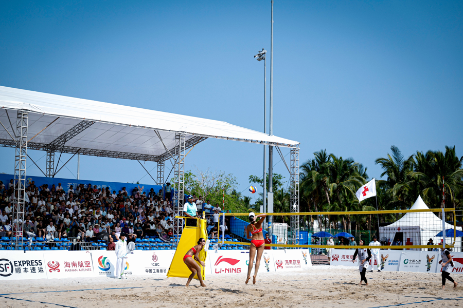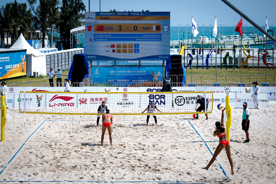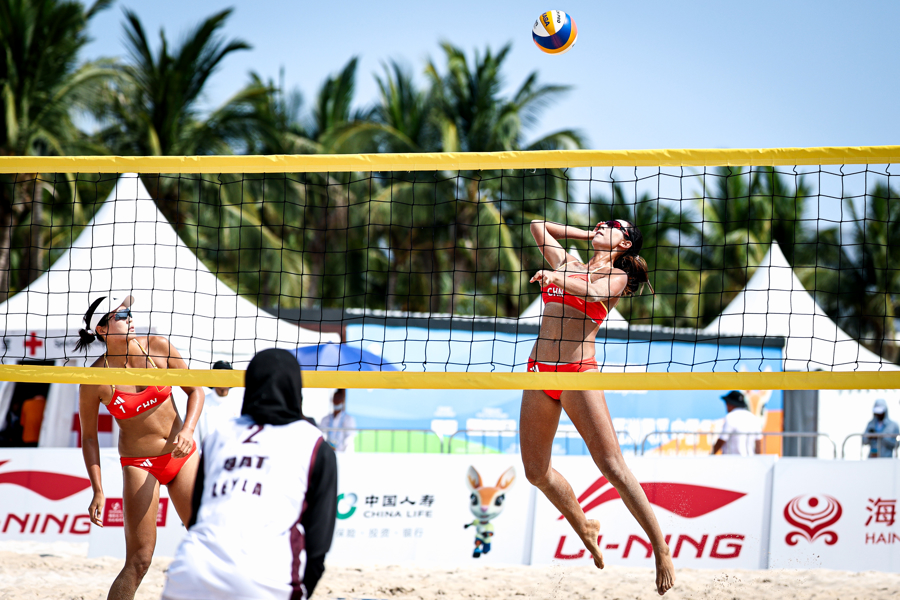 4月25日,第六届亚洲沙滩运动会女子沙滩排球比赛在海南三亚继续进行。中国组合蒋凯悦/董颉、卡德丽叶哈来提/周明利均以2比0的大比分击败各自对手,顺利赢下比赛。