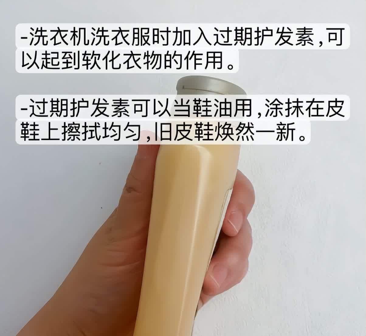 过期护发素还可以当成鞋油使用,涂抹在皮鞋表面,均匀擦拭,旧皮鞋就可以重新焕然一新了。