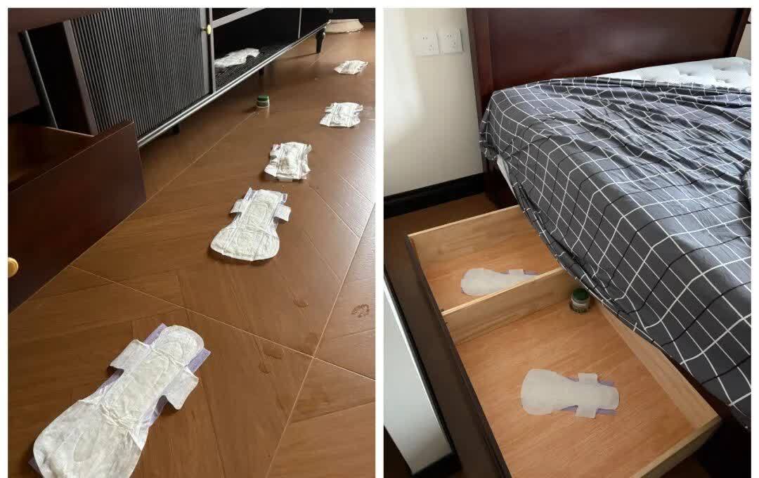 可以在卫生巾上面喷上水,然后粘贴在地面上,抽屉里,起到吸收甲醛的作用。