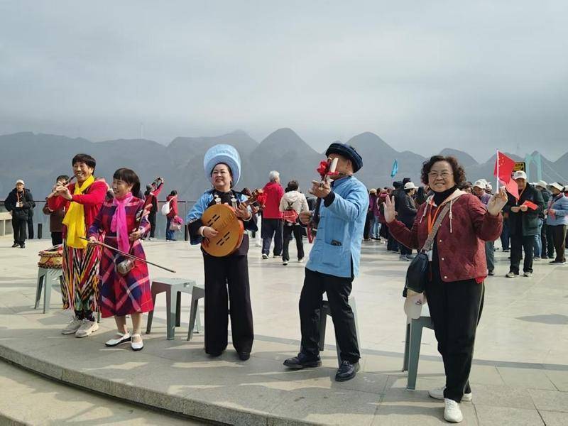 观景台旁,一阵合奏的乐声传来,国家级非物质文化遗产布依族“八音坐唱”正在表演。艺人们手持牛骨胡、月琴、箫筒、刺鼓、小马锣等乐器激情演奏,古朴流畅、节奏明快的旋律,承载着民族记忆与情感。“天籁之音”让游客们激动万分,纷纷举起手机,“咔、咔、咔”地记录下难得的文化邂逅。