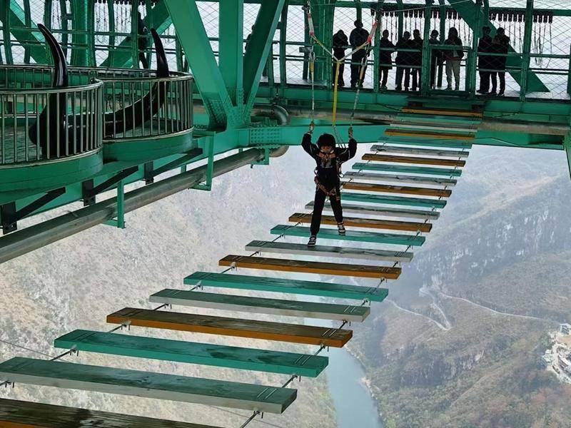 云端之桥的观光廊道中,游客们在挑战令人心跳加速的“云中项目”。透明的玻璃步道延伸向大桥另一端,脚下是深不见底的翠绿江水,仿佛漫步云端。