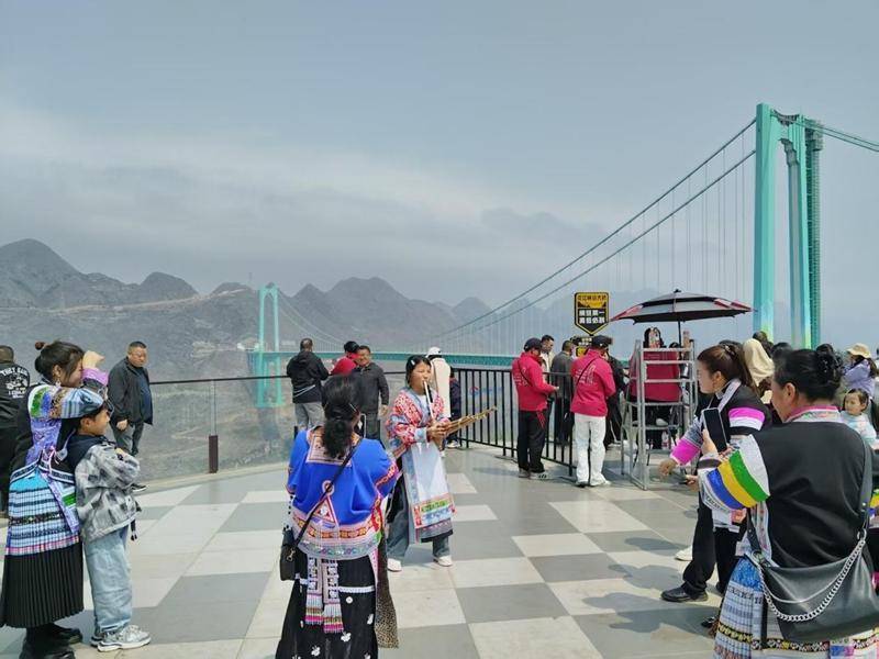 情到深处,何以抒怀?一位苗族姑娘取出芦笙,深情地吹奏起《我和我的祖国》来,游客被熟悉的旋律吸引过来,驻足聆听。空明嘹亮、悠扬婉转的笙乐响彻山谷,动人心魄的曲调在大桥上空间回荡、升腾,直冲云霄。