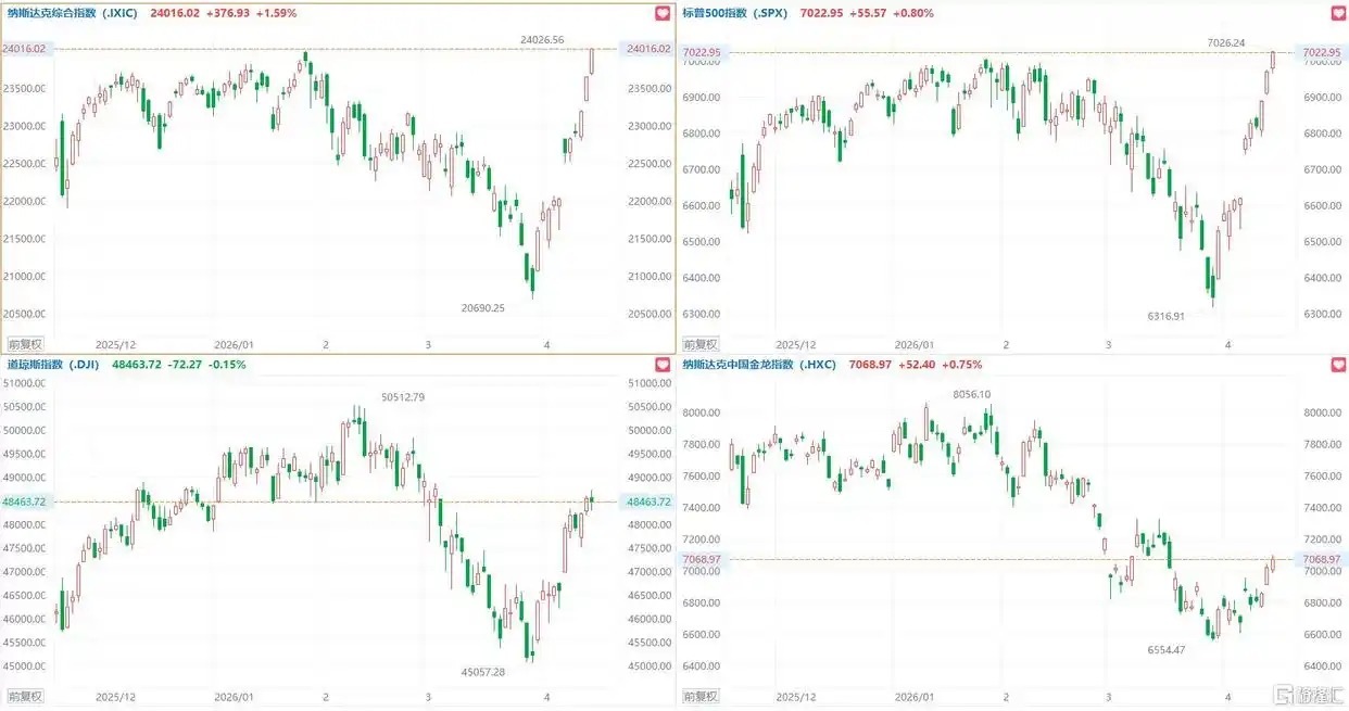 美国和伊朗正在考虑将停火协议延长两周,美股三大指数收盘涨跌不一,纳指涨1.59%,为连续11个交易日上涨并创收盘新高,这11个交易日累计涨幅超15%,标普500指数涨0.8%创历史新高,道指跌0.15%。大型科技股普涨,特斯拉涨超7%,微软、博通涨超4%,苹果涨近3%,英伟达、谷歌、Meta涨超1%。