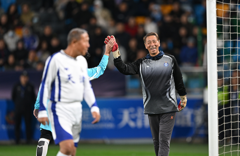 新华社照片,天津,2024年10月18日,天津元老队门将施连志(右)在比赛中。\n 当日,在天津泰达足球场举行的香港明星足球队天津友谊赛中,香港明星队2比2战平天津元老队。\n 新华社记者 孙凡越 摄