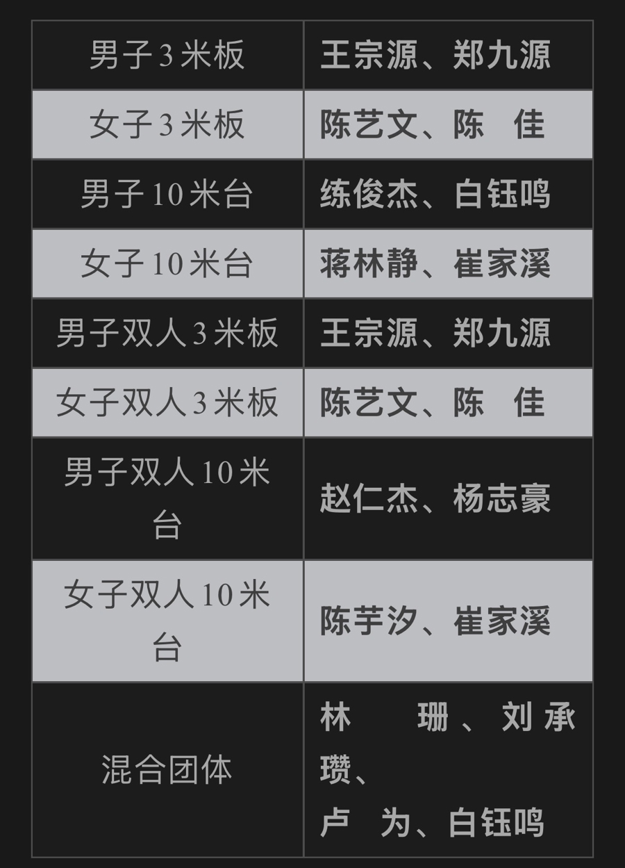 根据国家跳水队已公布的参赛名单,陈芋汐、王宗源、陈艺文等奥运冠军悉数在列。其中,陈芋汐将搭档崔家溪参加女子双人十米台比赛,王宗源将参加男子单人及双人3米板的比赛,陈艺文将参加女子单人及双人3米板的角逐。