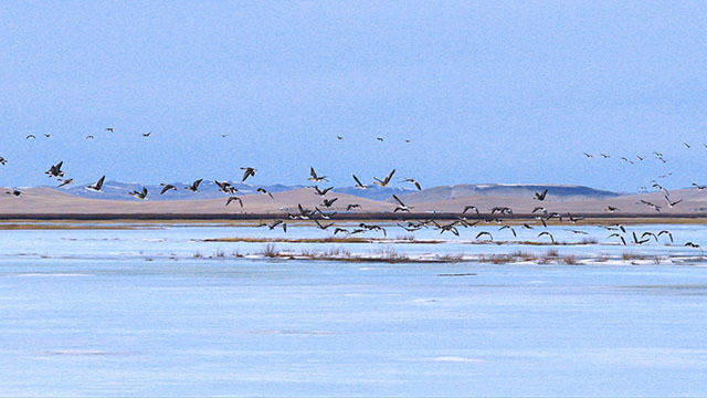 眼下,额仑草原依旧带着浅黄底色,去年的草茬密密匝匝。阳光洒落,水面泛起细碎金光。成群的候鸟时而掠水低飞,时而嬉戏游弋,时而引颈高歌,万鸟翔集的生动景象,与残雪、碧水相映成趣,勾勒出一幅灵动的春日画卷。